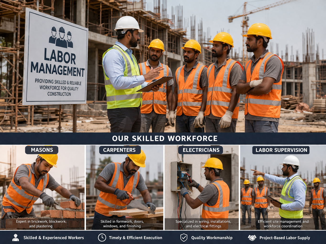 Our workforce is trained to maintain quality standards, follow safety protocols, and deliver precise workmanship across all stages of construction. Whether itβs a small task or a full-scale project, we ensure the right people are assigned to the right job.